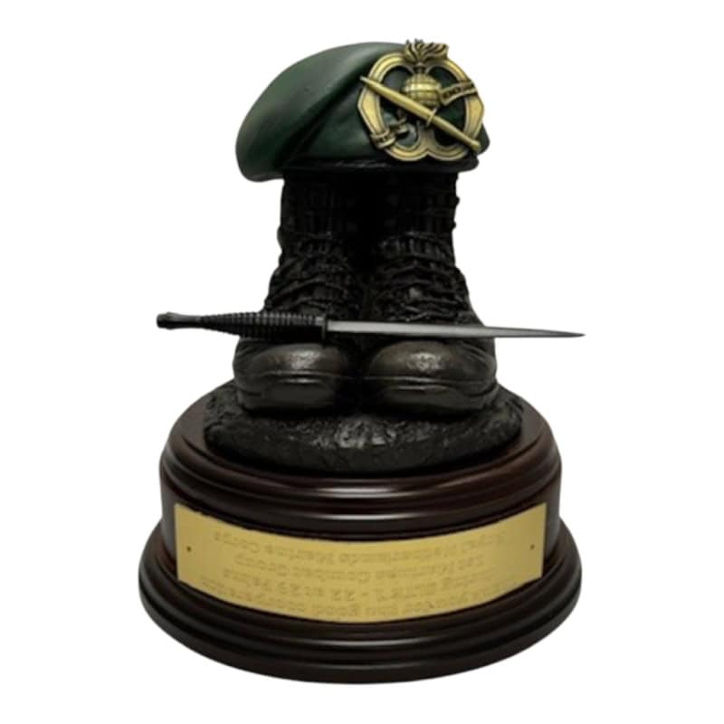 Elke sculptuur is handgemaakt door het Ballantynes of Walkerburn in Schotland, een specialist in militaire beelden. De boots zijn robuust en de baret met precisie gepositioneerd. Het beeld rust op een mahoniehouten sokkel. Met zijn hoogte van 13 cm en een gewicht dat de kwaliteit voelbaar maakt, is dit beeld uitermate geschikt als cadeau.