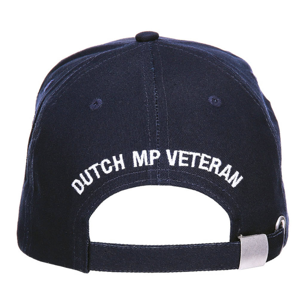 Deze cap is van 100% katoen en volledig verstelbaar via een clip-sluiting aan de achterzijde. Verder beschikt de baseball cap over een geborduurd veteranen draaginsigne logo, het logo van de Nederlandse landmacht aan beide zijkanten en de opdruk ‘Dutch MP Veteran’ aan de achterkant.
