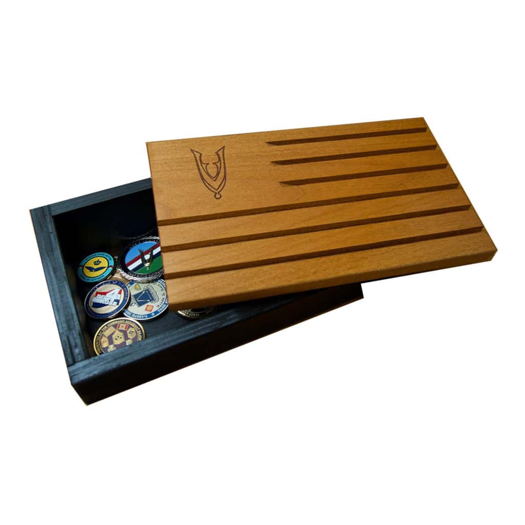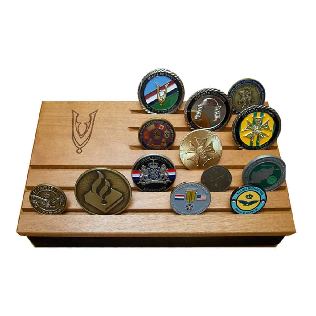 Veteranenshop en Praefero hebben na het succes van de andere coin displays de hoofden bij elkaar gestoken om een luxere uitvoering te maken met een mooie gravure van het veteranen draaginsigne. We waren van mening dat coins niet alleen een supermooie presentatie verdienen maar dat het tevens handig zou zijn, wanneer er een opbergbak beschikbaar is om andere coins of munten, medailles of emblemen in op te bergen om ze te beschermen tegen stof of krassen.