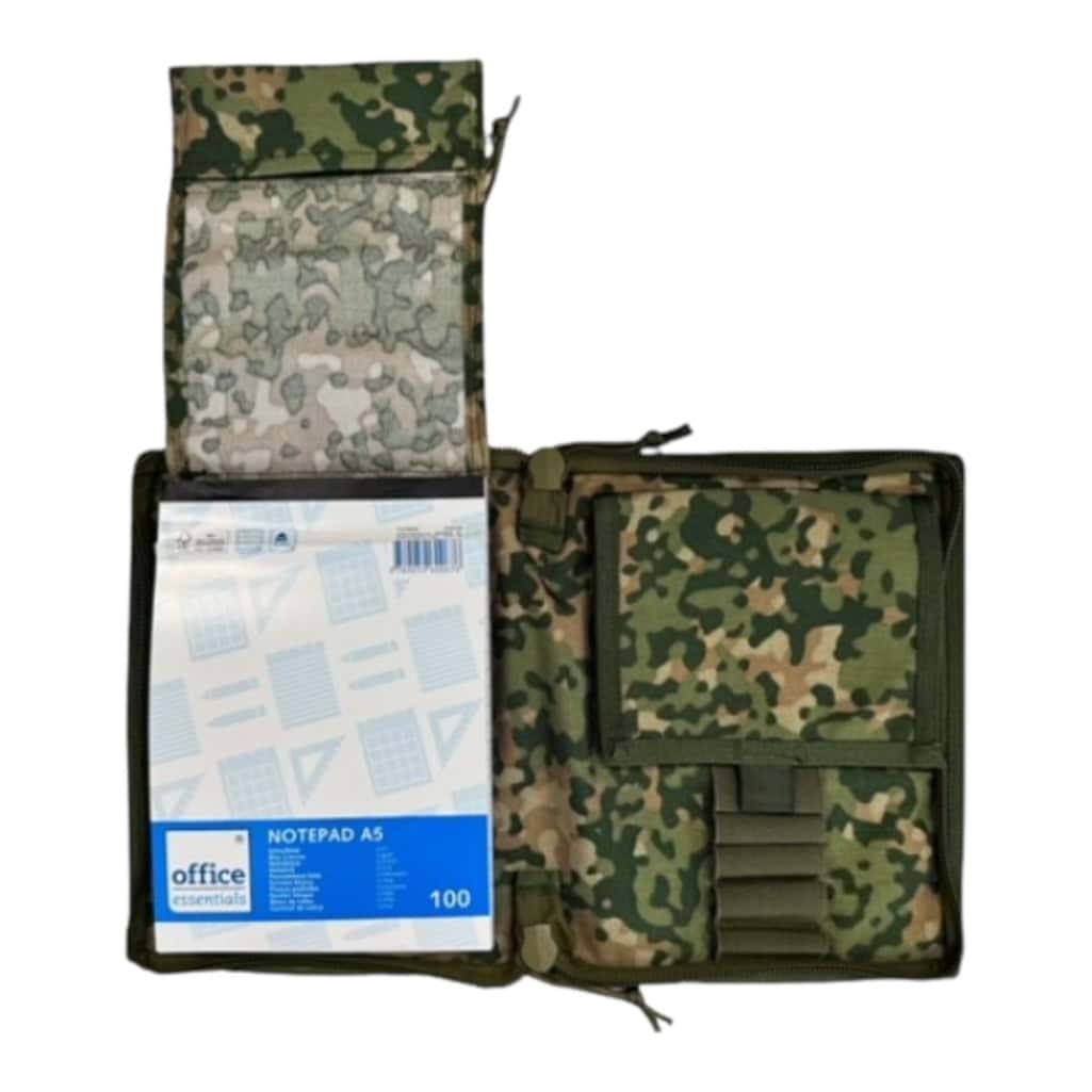 Robuuste cover voor A5-notitieboeken, ontworpen voor dagelijks gebruik in het veld of op kantoor. Voorzien van klittenband voor een naamlint, een ruim kaartenvak (23 × 13,5 cm) en slimme pennenhouders. Afmeting: 25 × 19 cm. Compact, functioneel en klaar voor actie.