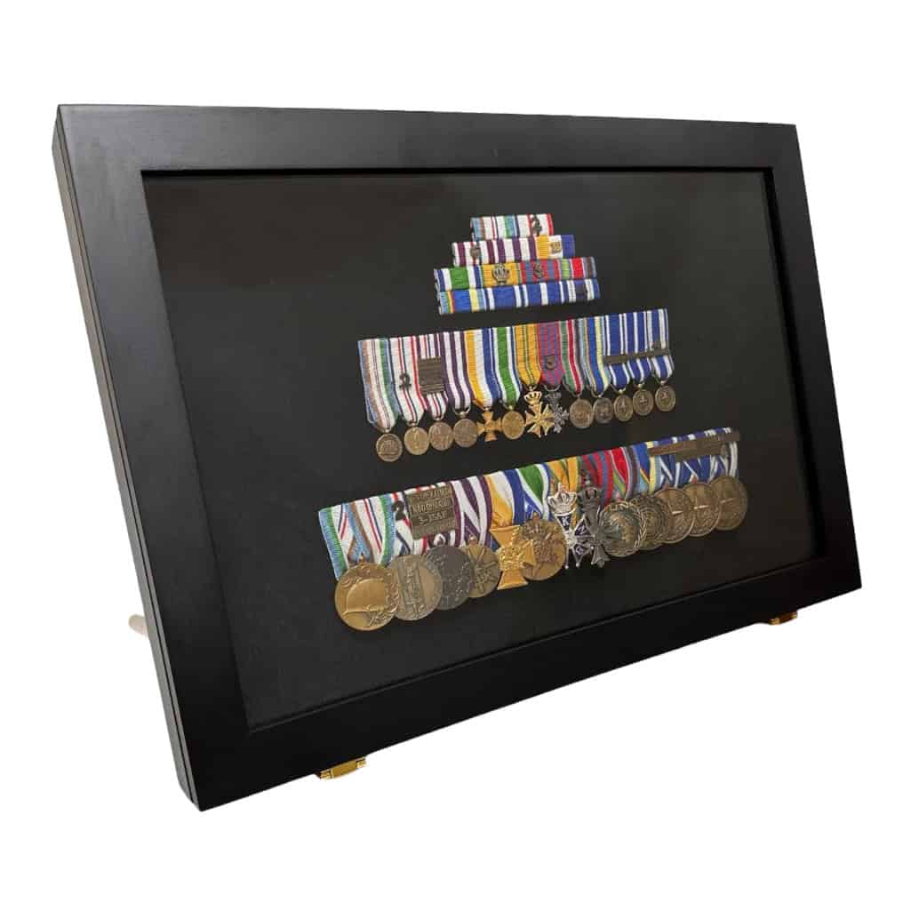 Let op! De hoogglans gepolijste, massief messing pennen zitten niet standaard inbegrepen bij de medailledisplay. Vergeet dus niet de bijpassende massieve pennen mee te bestellen wanneer jij je shadowbox staand wilt plaatsen!