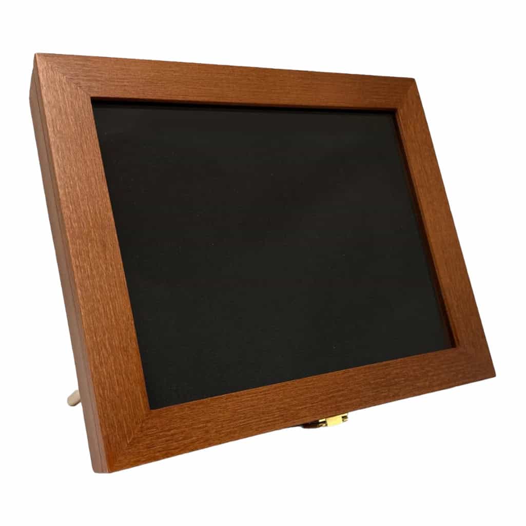 Deze elegante medaille display van het merk Praefero is van hoogwaardige kwaliteit en wordt in Nederland op vakkundige en ambachtelijke wijze gemaakt. De displaybox beschikt over luxe, ingefreesde scharnieren en ontspiegeld glas. Tevens is er gedacht aan ruimte voor het opbergen van eventuele drukknopjes van je spelden, pins of medailles.