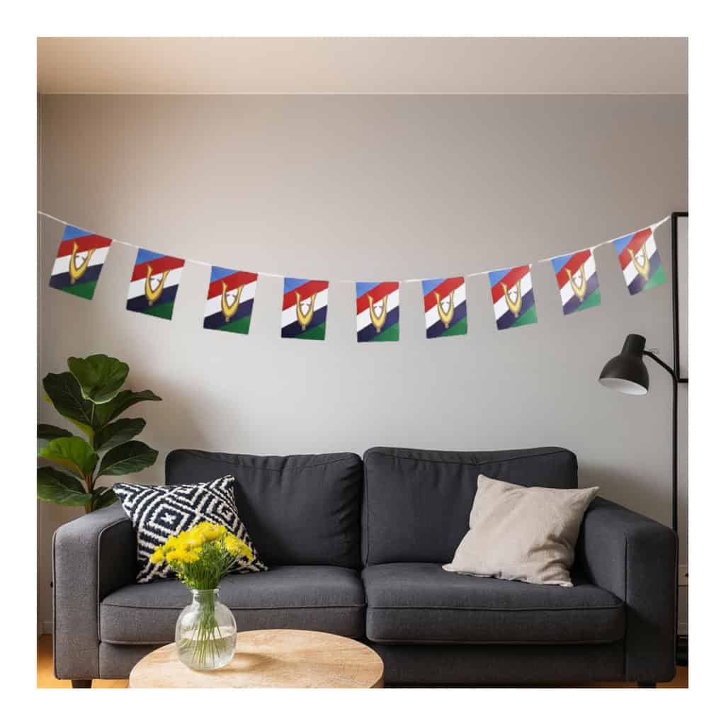 De vlaggenlijn bestaat uit 20 rechthoekige vlaggen van 15 x 21 cm groot. Totale lengte: 5 meter lang. De bedrukking is tweezijdig en in full color bedrukt. De slinger is gemaakt van vlamwerend papier met een brandvertragende werking. Deze zijn hierdoor ook geschikt voor indoor horecagelegenheden.