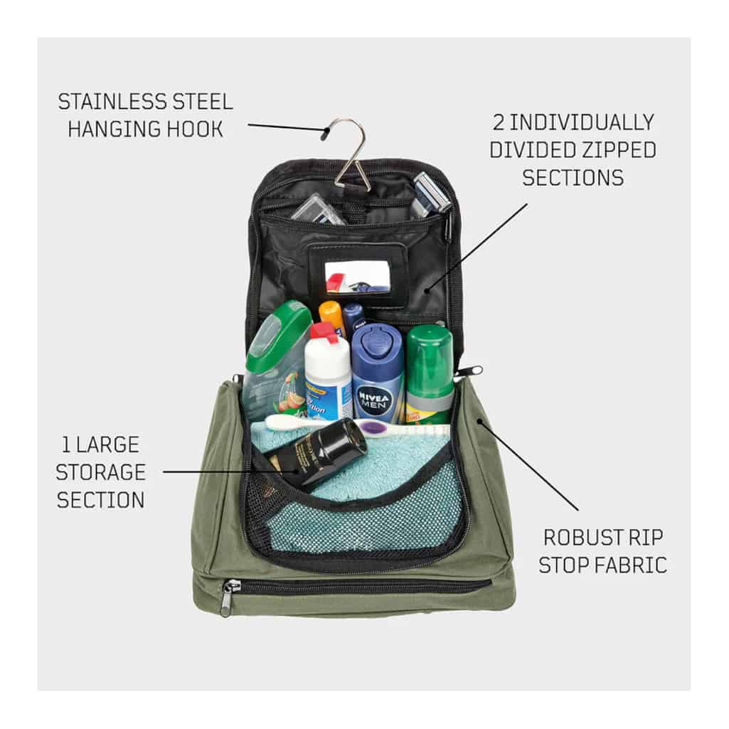 Deze luxe toilettas bevat een handig opbergvak om je natte spullen op te bergen en een groot middengedeelte om te voorkomen dat de tas met inhoud omvalt. Verder beschikt de Snugpak wash bag over een draagriem een afneembare spiegel en een handige ophanghaak van RVS. Het compacte ontwerp is gemaakt van robuuste ripstof stof (600D heavy Duty Nylon) en beschikt over 2 individueel verdeelde delen met ritssluiting, een groot opbergvak, vier elastische opbergvakken en een opbergvak voor je natte spullen. De toilettas weegt 320 gram.